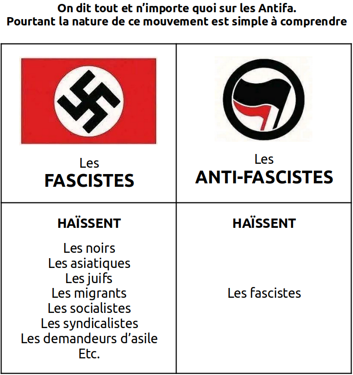 On dit tout et n’importe quoi sur les Antifa. Pourtant la nature de ce mouvement est simple à comprendre : - Les fascistes haïssent : les noirs, les asiatiques, les juifs, les migrants, les socialistes, les syndicalistes, les demandeurs d'asiles, etc. - Les anti-fascistes haïssent : les fascistes.