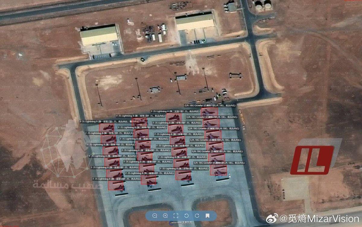 Satellite image by the Chinese reportedly shows 18 USAF F-35 aircraft, in addition to 6 E/A-18G electronic warfare aircraft, at Muwaffaq Salti Air Base in #Jordan.