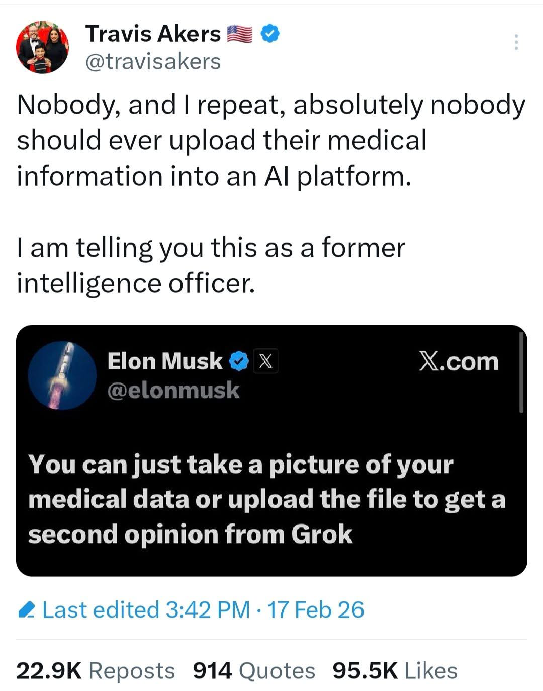 Two part image. Top part by @travisakers Nobody, and I repeat, absolutely nobody should ever upload their medical information into an Al platform. I am telling you this as a former intelligence officer. As a response to Elon Musk & X X.com You can just take a picture of your medical data or upload the file to get a second opinion from Grok