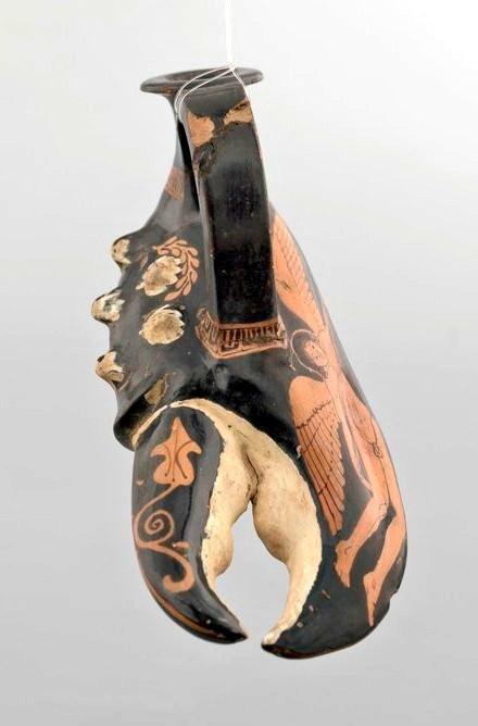 This is a marvelous example of whimsy and craftsmanship! A rare Greek askos, made in the shape of a lobster claw. Dating back to approximately 450 BC, the vessel was used to hold perfumed oil. 🦞