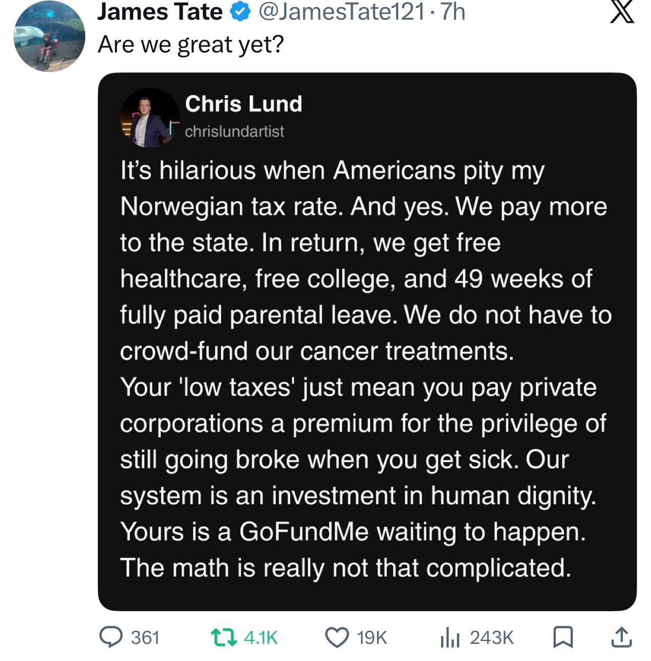Durchschnittsbürger zahlen 40-50% Steuern um damit Infrastruktur, Bildung und Innovationen zu finanzieren.