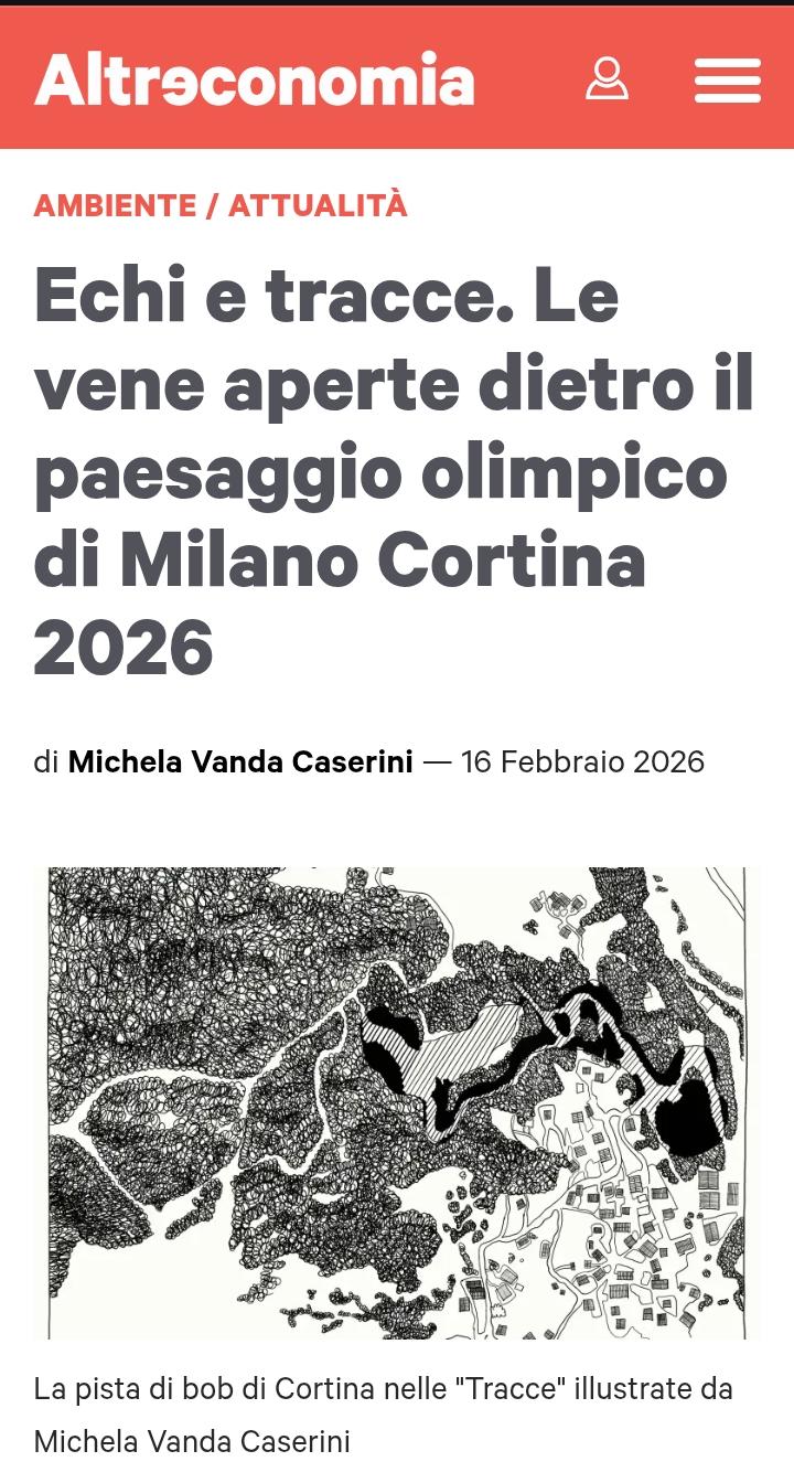 Didascalia ALT esaustiva: Screenshot di un articolo del sito Altreconomia, nella sezione Ambiente/Attualità, intitolato "Echi e tracce. Le vene aperte dietro il paesaggio olimpico di Milano Cortina 2026", scritto da Michela Vanda Caserini e datato 16 febbraio 2026. Sotto il titolo è presente un disegno in bianco e nero che rappresenta una mappa dettagliata della pista di bob di Cortina, illustrata con tratti grafici complessi e stilizzati, accompagnata dalla didascalia: "La pista di bob di Cortina nelle 'Tracce' illustrate da Michela Vanda Caserini".