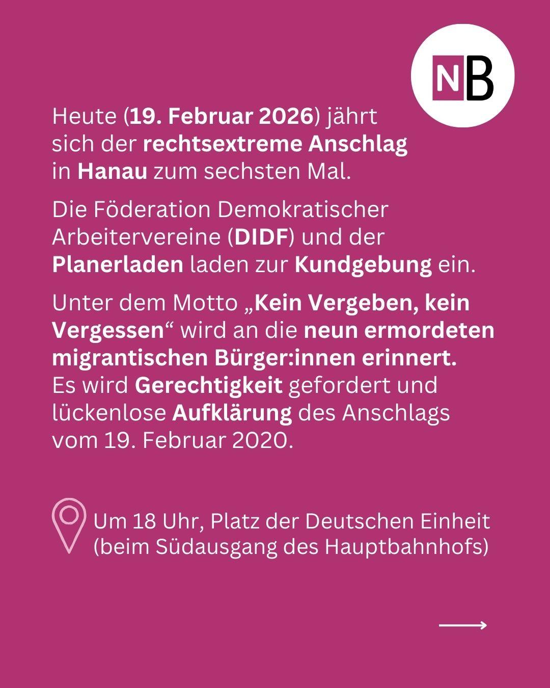 Unter dem Motto „Kein Vergeben, kein Vergessen” findet heute eine #Gedenkveranstaltung anlässlich des Terroranschlags in #Hanau, um 18 Uhr am Platz der Deutschen Einheit in #Dortmund, statt. Außerdem gibt es eine Lesung im Taranta Babu. #Erinnerungsarbeit #Gedenken #Planerladen #Rechtsextremismus #saytheirnames
