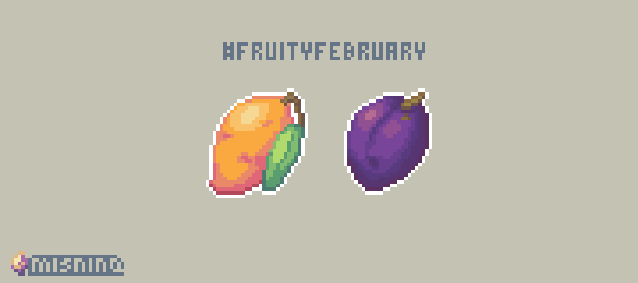 Two pixel art icons at 32x32px of a mango and a plum. The text days #FruityFebruary