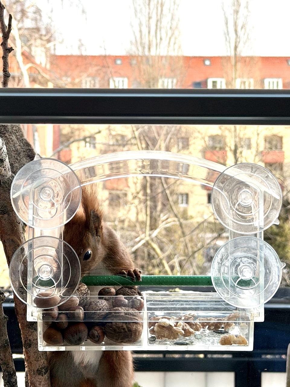 In einem Futterhaus, das an einer Scheibe hängt, liegen verschiedene Nüsse. Ein Eichhörnchen schaut durch die Scheibe in die Kamera.