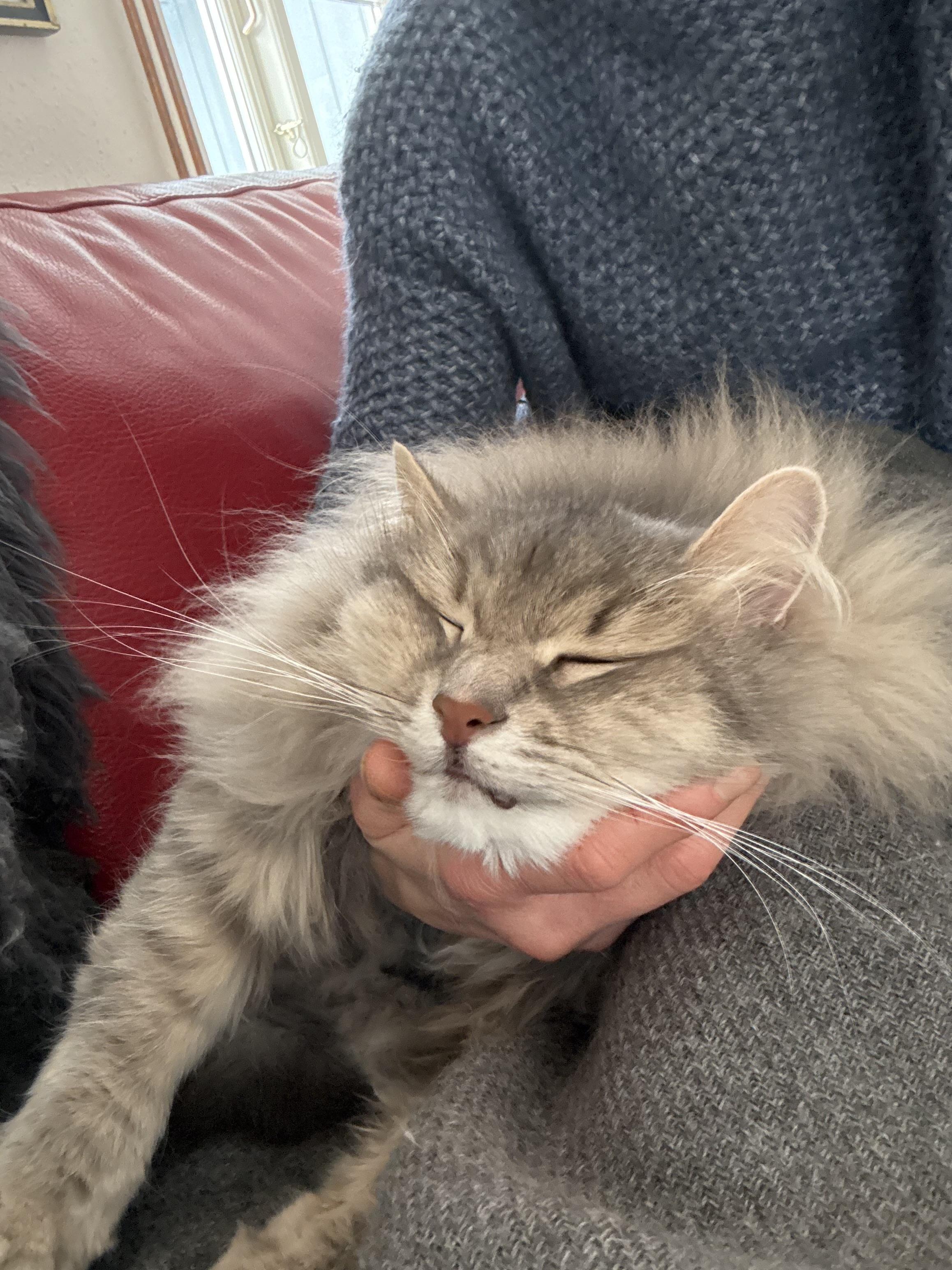 Closeup of a grey Siberian cat (Knold) lying on a couch. The picture is taken in front of him. He looks to be sleeping, lying on my wife’s legs (covered by a grey blanket), while his head is being held up by her hand. His right front paw is hanging down, all relaxed. He is very fluffy, and his long white whiskers are very prominent.