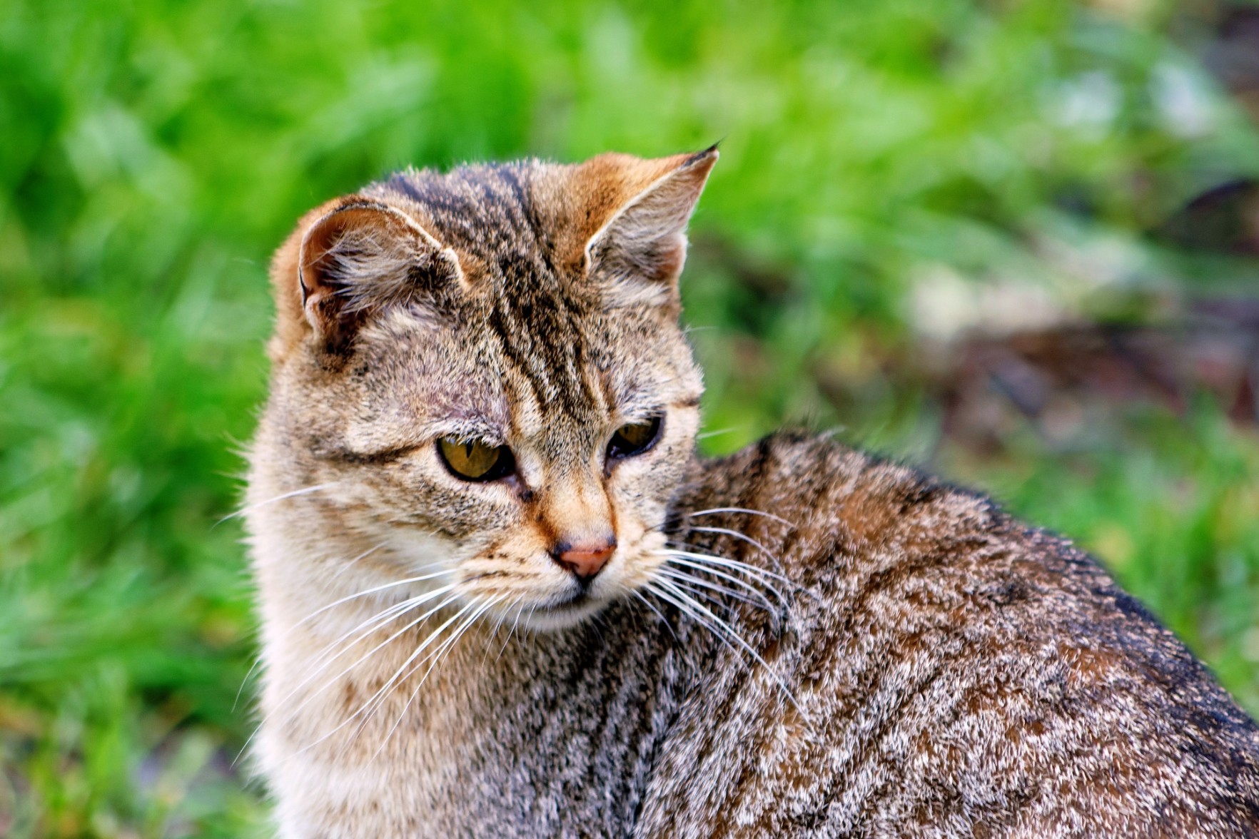 Well-striped tabby cat looks over its shoulder while exploring the world. Colors are silver and tan but the stripes are pure Tiger.
