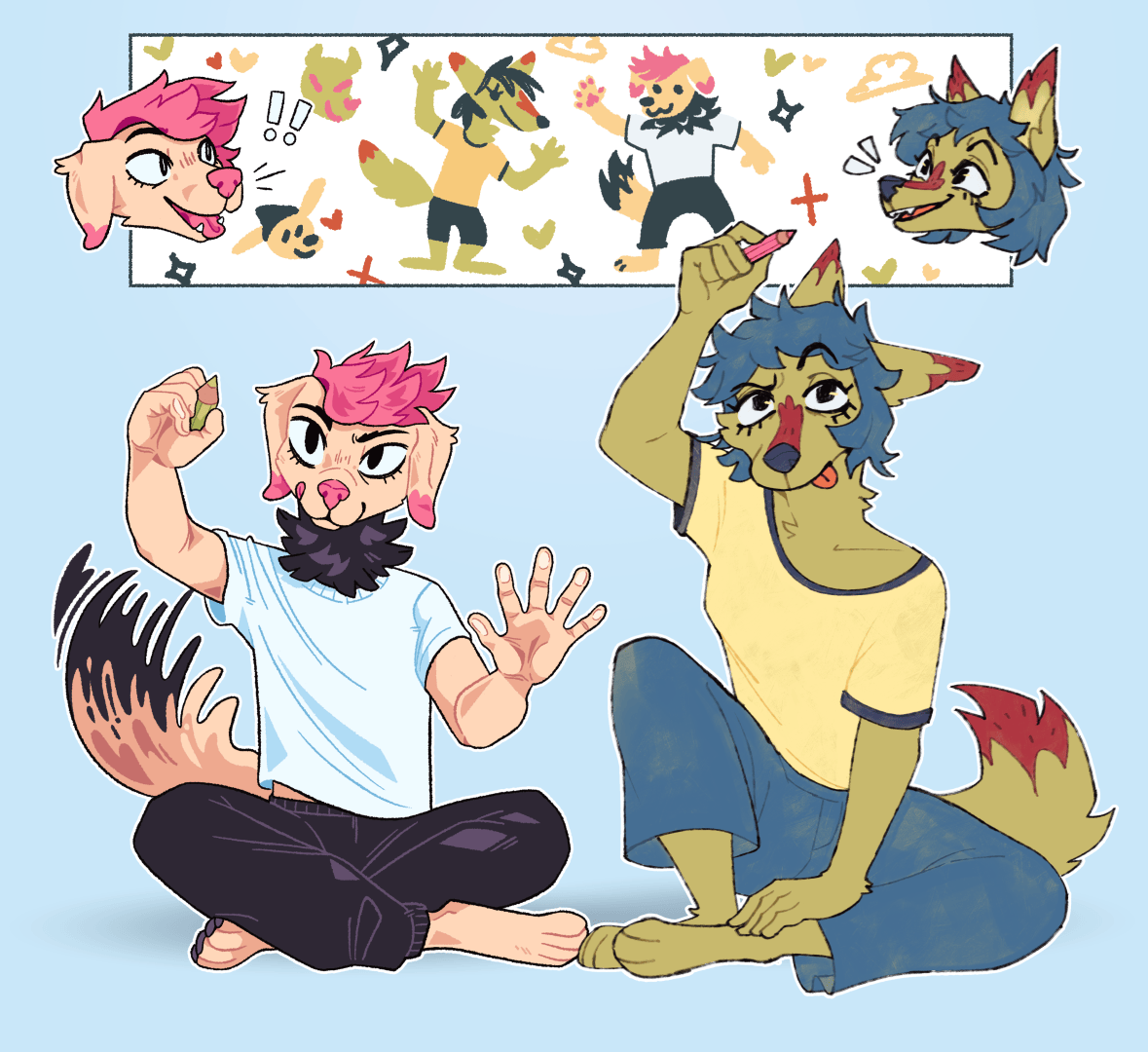 A collab I did with my pal Fizzlesoda! He drew my sona drawing his sona, and vice versa! 🐶🖍️