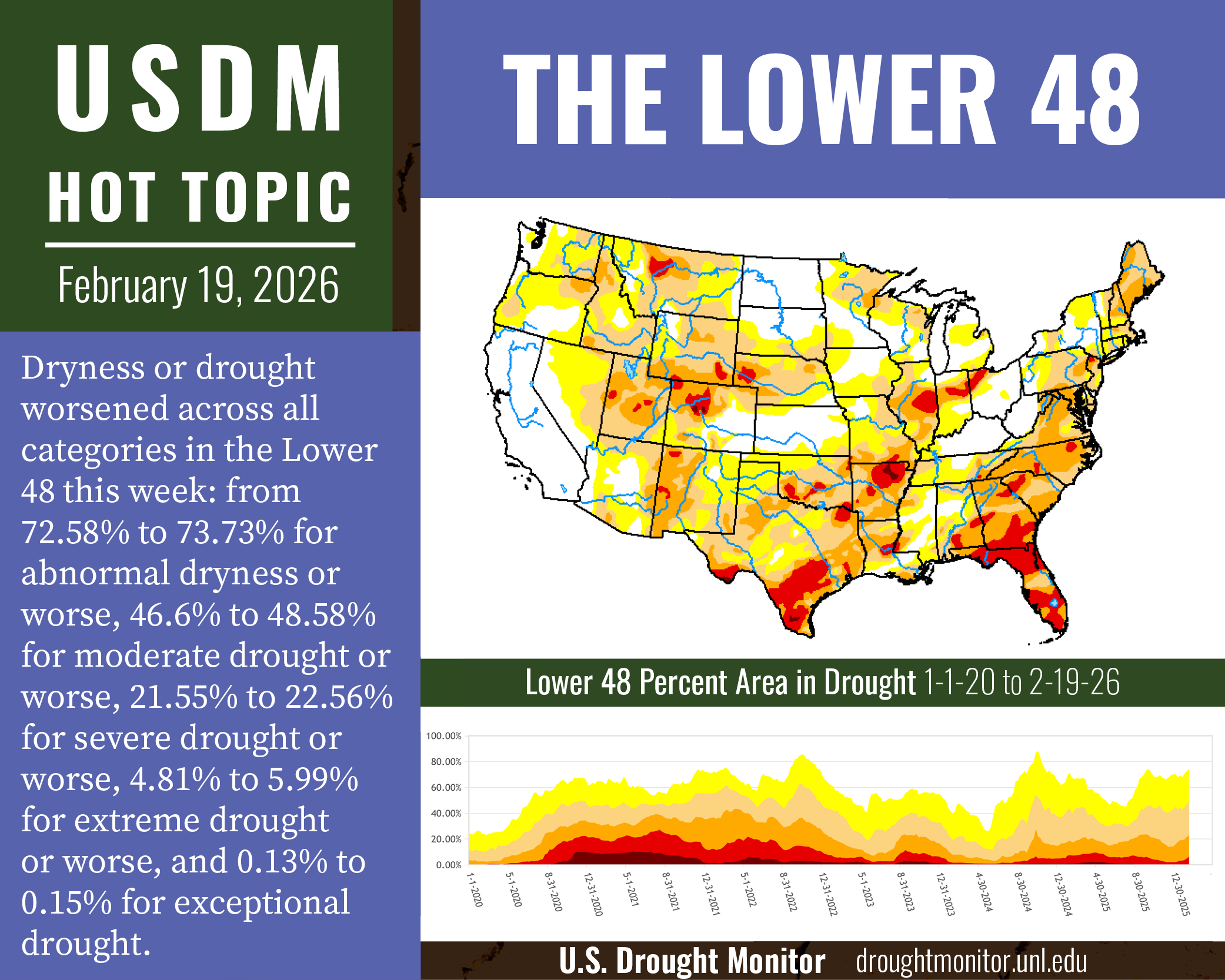 Nearly half of the Lower 48 is in drought this week, with 48.58% in moderate drought or worse. The last time this much of the U.S. was in drought was the week of Nov. 12, 2024.