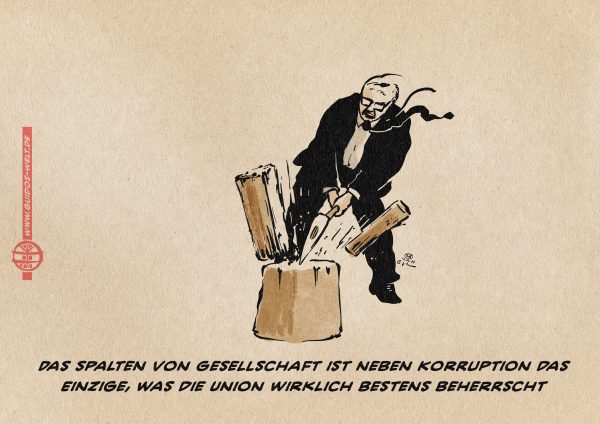Illustration eines Holzspaltenden Mannes im Anzug. Textzeile: Das Spalten von Gesellschaft ist neben Korruption das Einzige, was die Union wirklich bestens beherrscht.