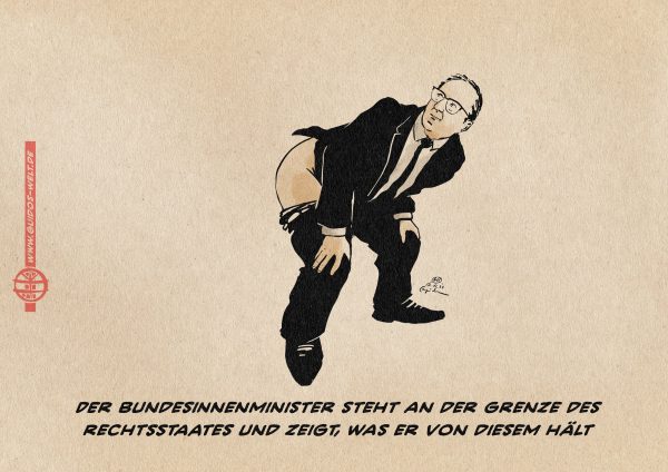 Illustration von Dobrinth, der sich die Hose runterzieht und zum Gruß seinen Hintern zeigt. Textzeile: Der Bundesinnenminister steht an der Grenze des Rechtsstaates und zeigt, was er von diesem hält.