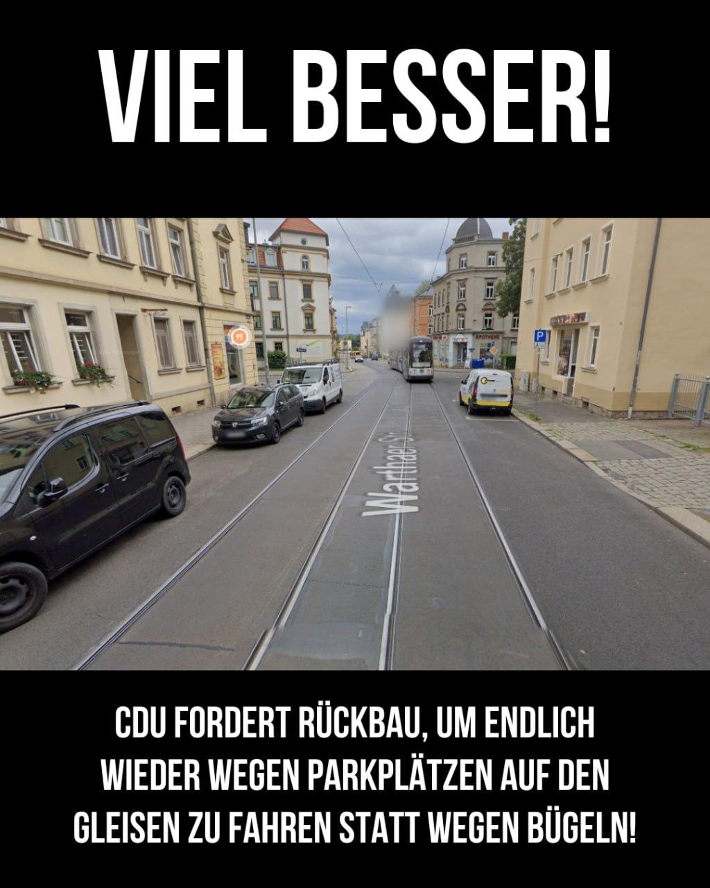 Auf der Warthaer Straße stehen Fahrradbügel. "Pfui!", rufen CDU, FreieWähler und TeamZastrow empört. Weil es gefährlich sei, wenn man mit Fahrrad oder Auto in den Gleisbereich gedrängt wird - und sich dieser so schneller abnutze. Darum soll Baubürgermeister Kühn die Bügel der Schande schnellstmöglich wieder rausreißen.