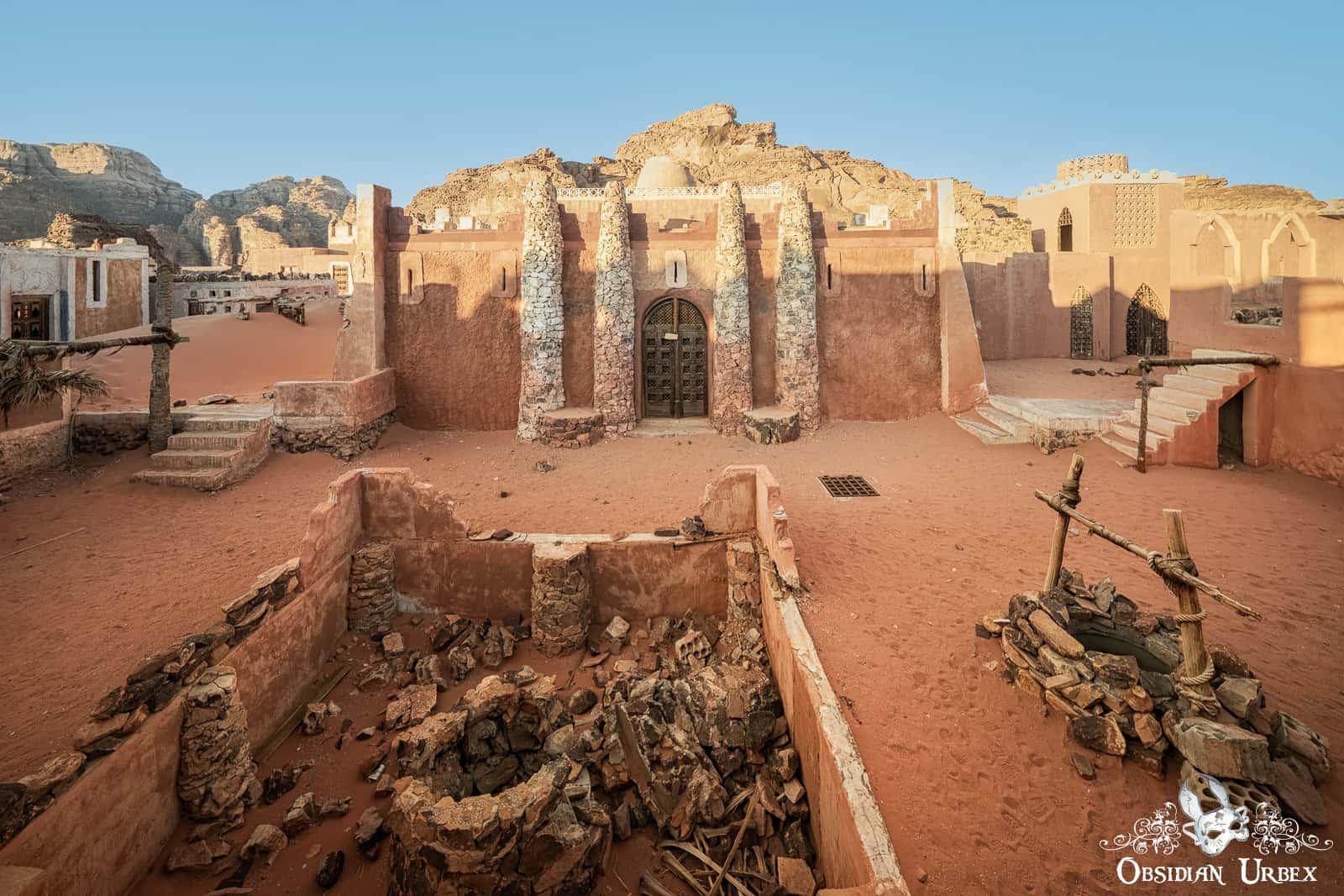 An elevated view of an abandoned desert film set featuring reddish-orange buildings and sand. Ruins are in the foreground, with a fortified main building behind.