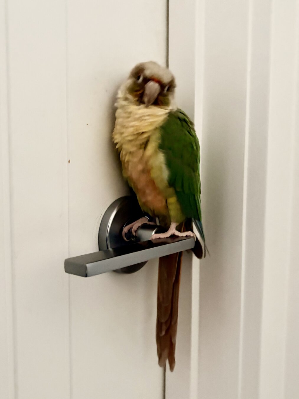 Pete’s favourite place in all the world 😍❤️ this is my son’s bedroom door handle. Pete adores my son 😛😛😛🦜💚🦖 #parrot #birb #PiratePete