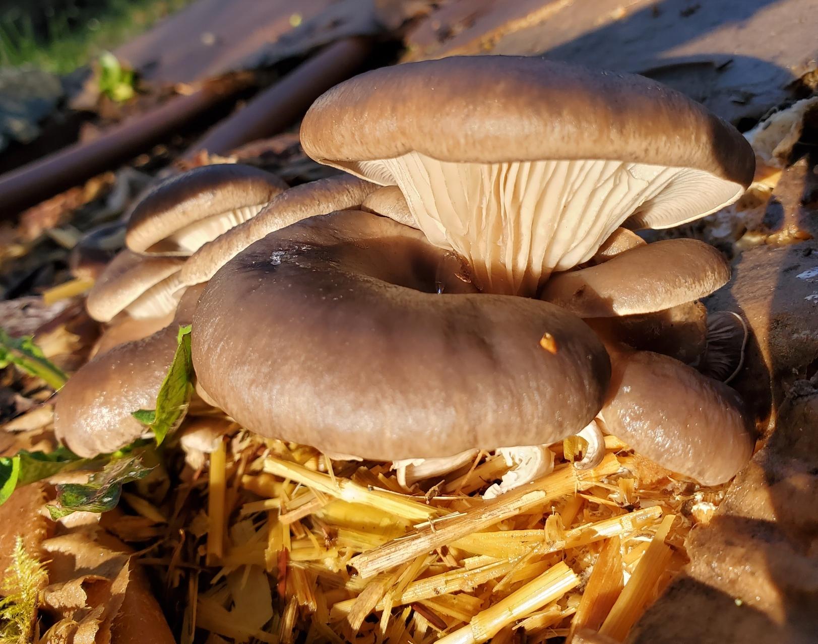 A cluster of oyster mushrooms with brown, fan-shaped caps and visible white gills, growing on a bed of straw and green foliage, with sunlight highlighting the details.