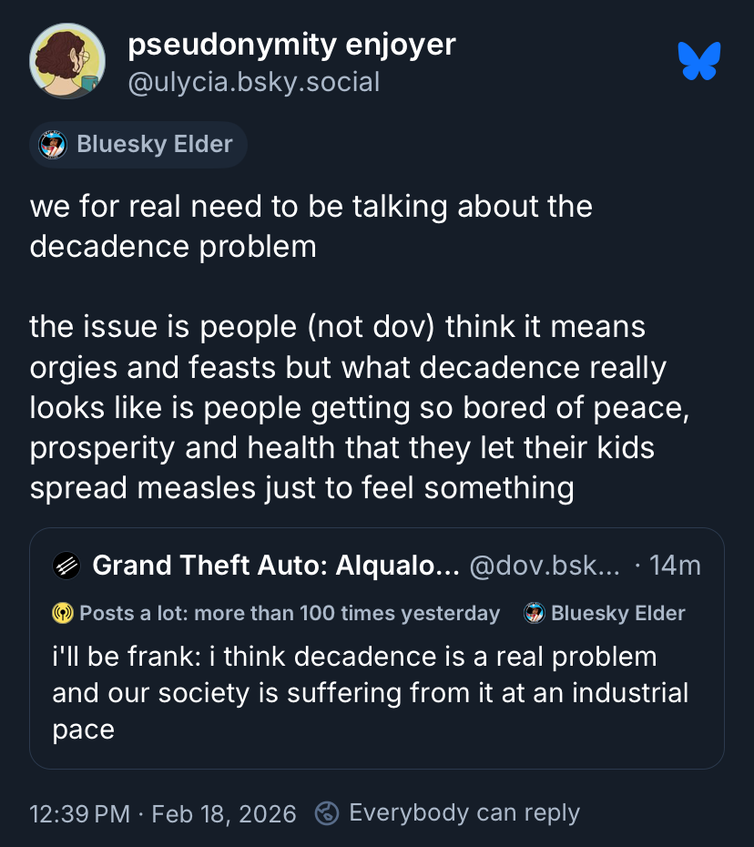A screenshot of a Bluesky post: @ulycia.bsky.social we for real need to be talking about the decadence problem the issue is people (not dov) think it means orgies and feasts but what decadence really looks like is people getting so bored of peace, prosperity and health that they let their kids spread measles just to feel something [quoted post: @dov.bsky.social: i'll be frank: i think decadence is a real problem and our society is suffering from it at an industrial pace ]