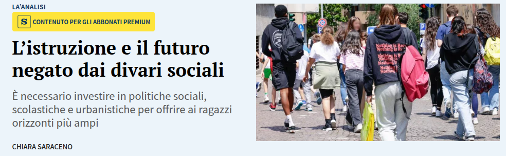L’istruzione e il futuro negato dai divari sociali: https://archive.fo/FSNuu#selection-995.0-995.50 Un articolo di Chiara Saraceno su la Stampa riflette sulle cause della dispersione scolastica soprattutto nelle periferie di #Milano e #Torino