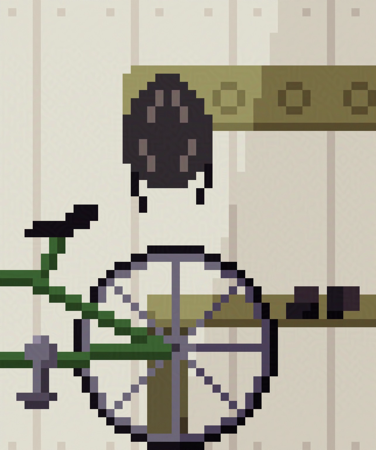 A pixel art bike in front of a put-away helmet and gloves