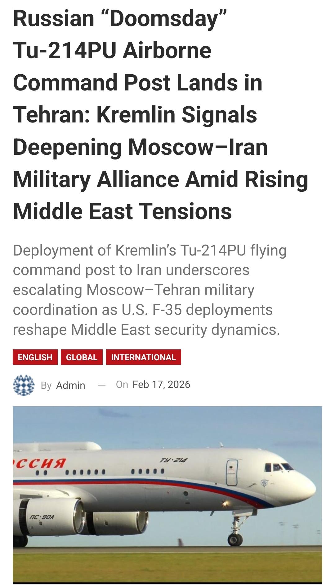 The departure of flight RSD420, a Tupolev Tu-214PU airborne command post operated by #Russia’s elite Rossiya Special Flight Squadron, from Moscow’s Vnukovo International Airport to Tehran’s Khomeini International Airport on 16 Feb. 2026 represents a calibrated geopolitical signal rather than a routine aviation movement, underscoring intensifying Moscow–Tehran strategic coordination at a moment of heightened regional volatility
