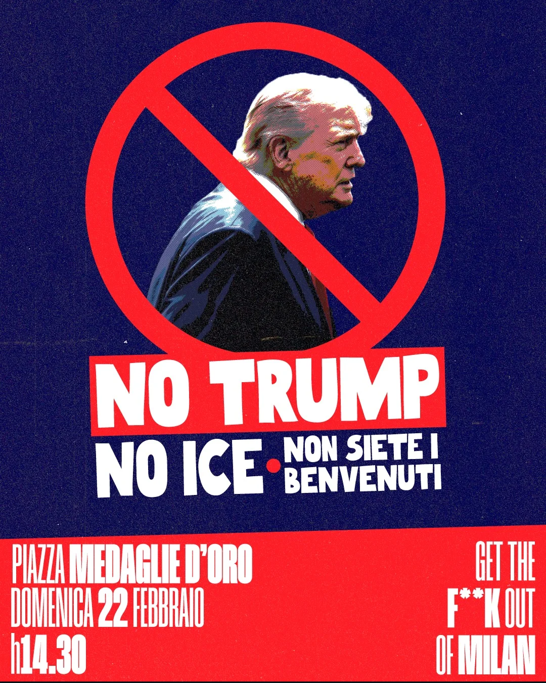 Poster di protesta con sfondo blu scuro. Al centro c’è il profilo di Donald Trump attraversato da un simbolo rosso di divieto (cerchio con barra diagonale). Sotto l’immagine si legge in grande: “NO TRUMP” e “NO ICE · NON SIETE I BENVENUTI”. Nella parte inferiore, su fondo rosso, il testo riporta: “Piazza Medaglie d’Oro, Domenica 22 Febbraio, h14.30”. A destra compare la scritta in inglese: “Get the F**k out of Milan”.