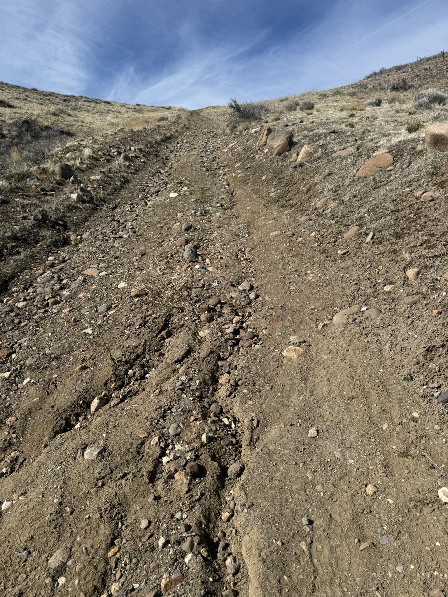 A wide steep uphill trail that seems to disappear into the blue sky. Yes, very steep.