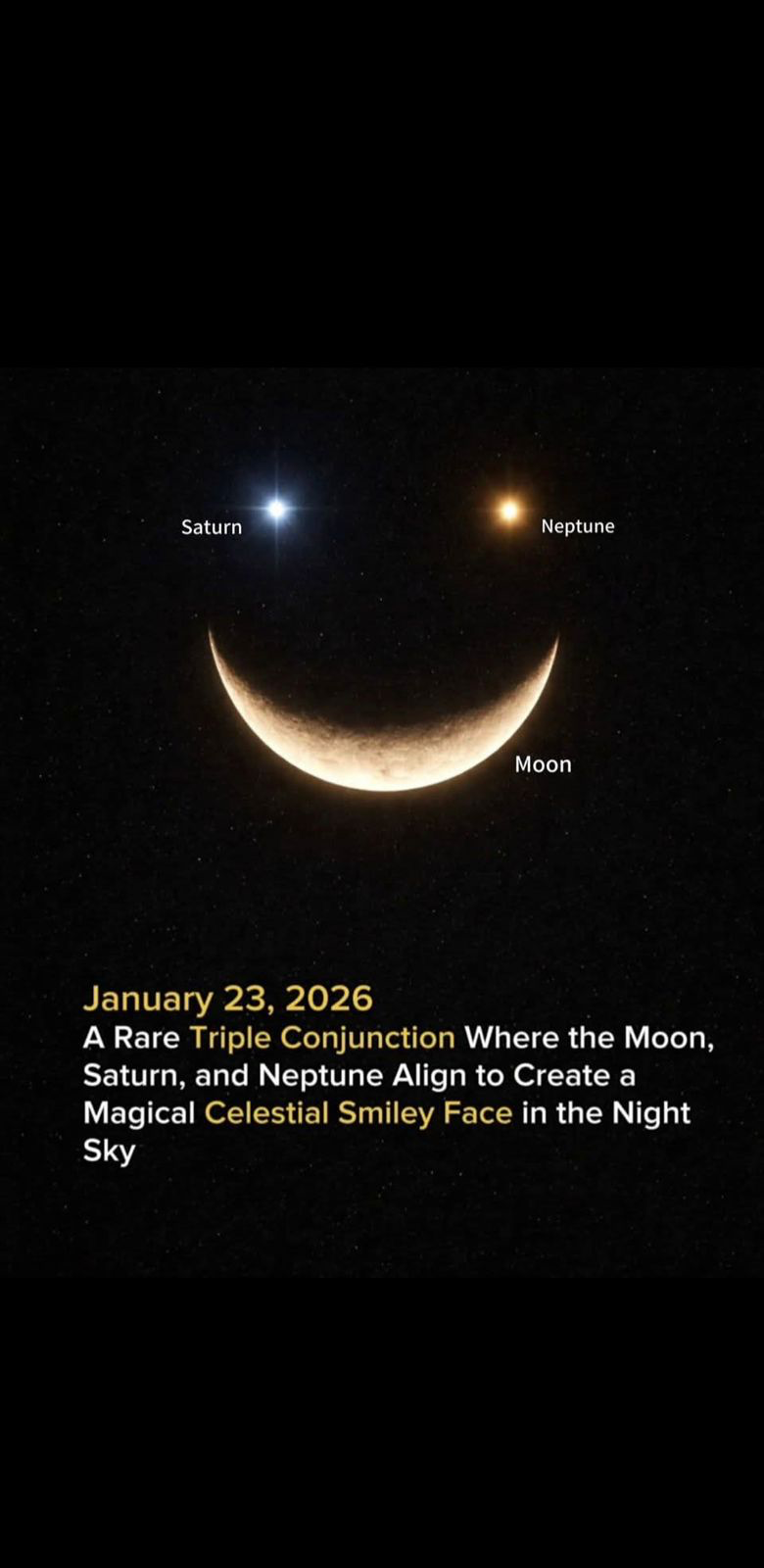 Graphic, not real image, of a crescent moon with Saturn and Neptune placed to make the image look like a smiley face.